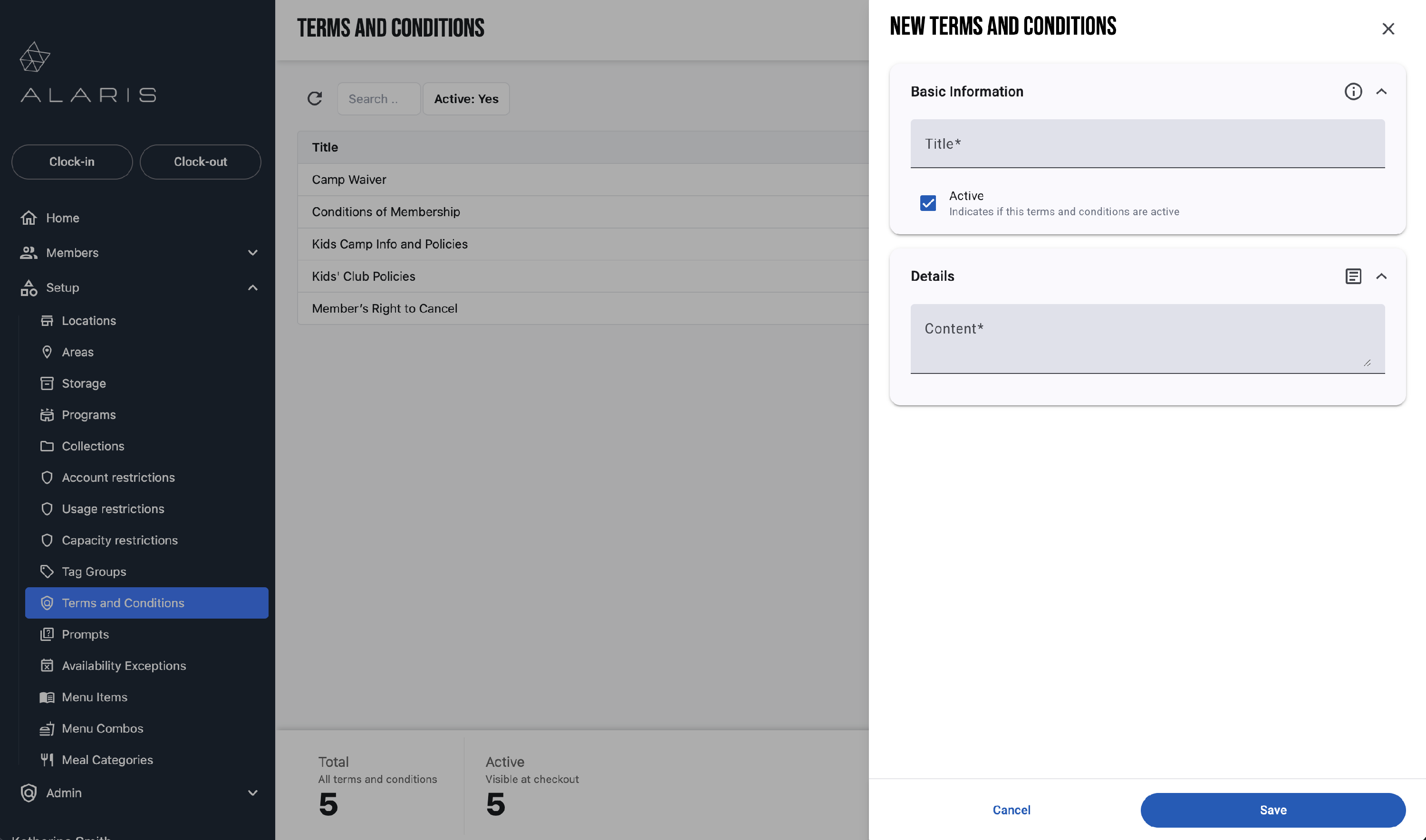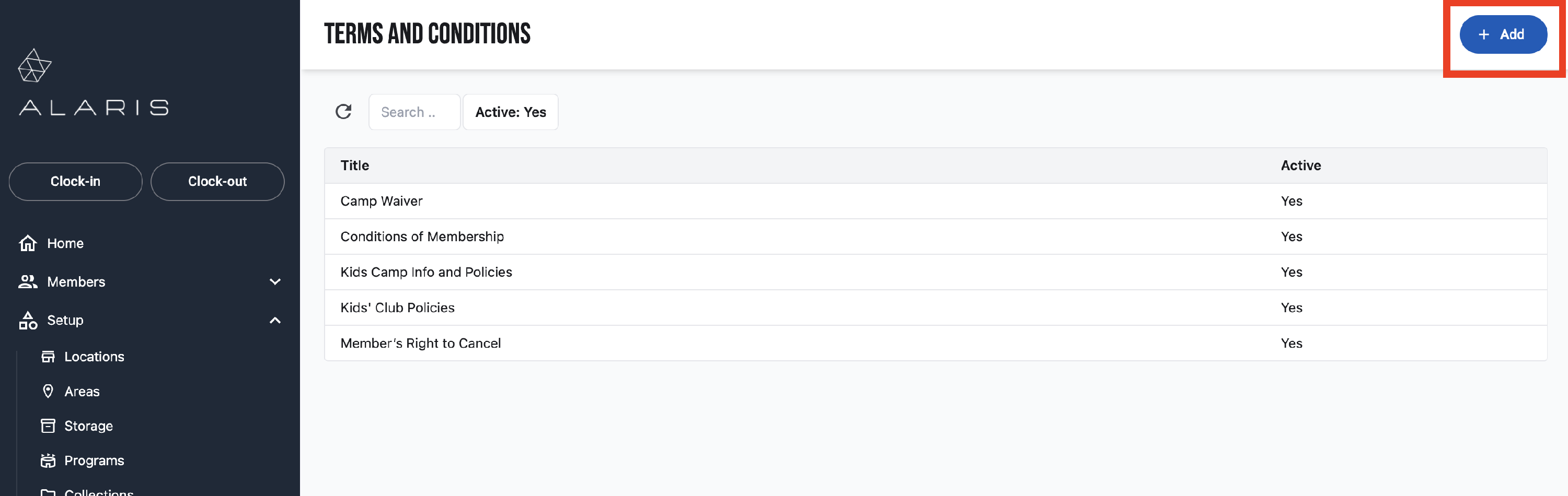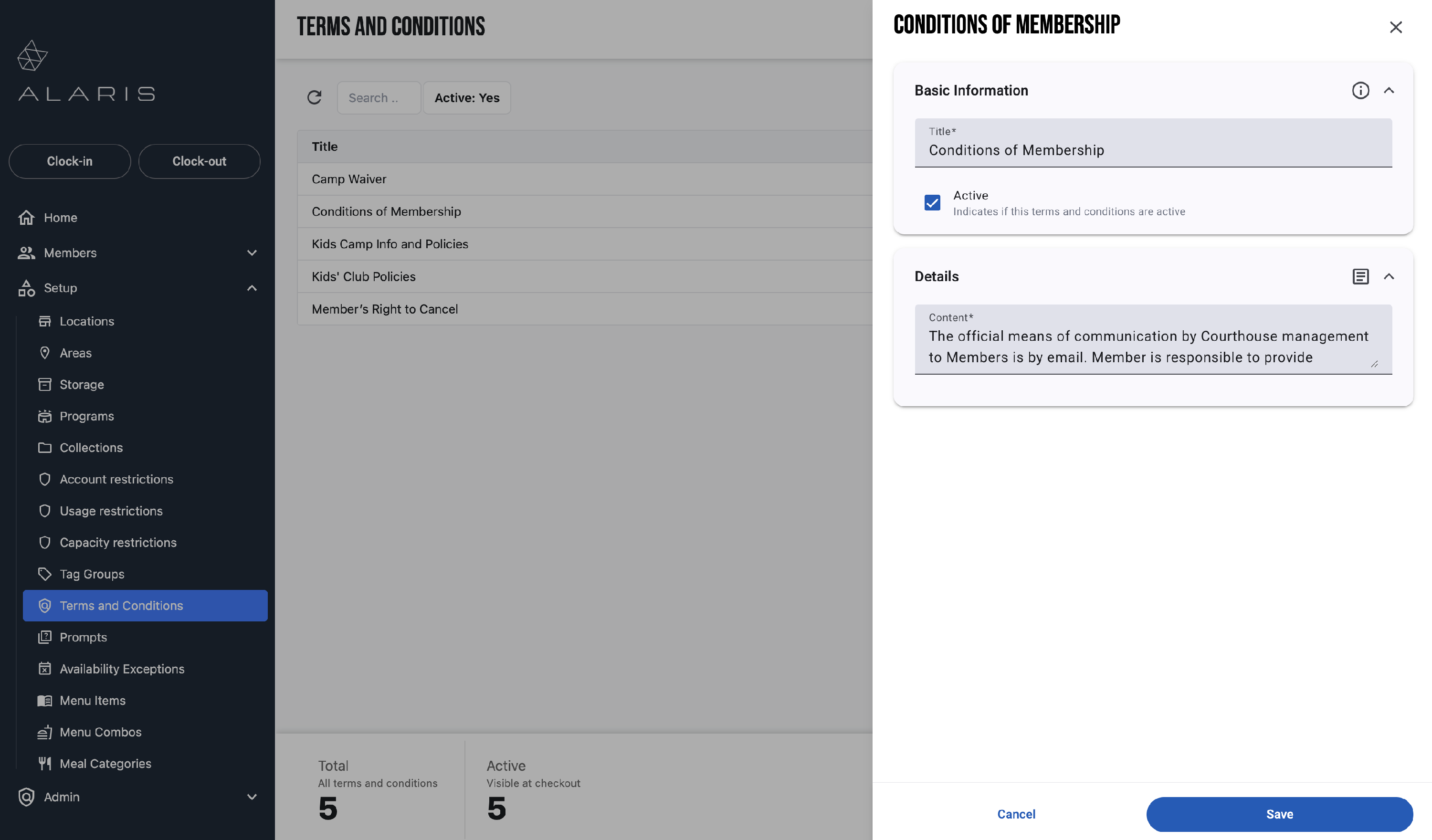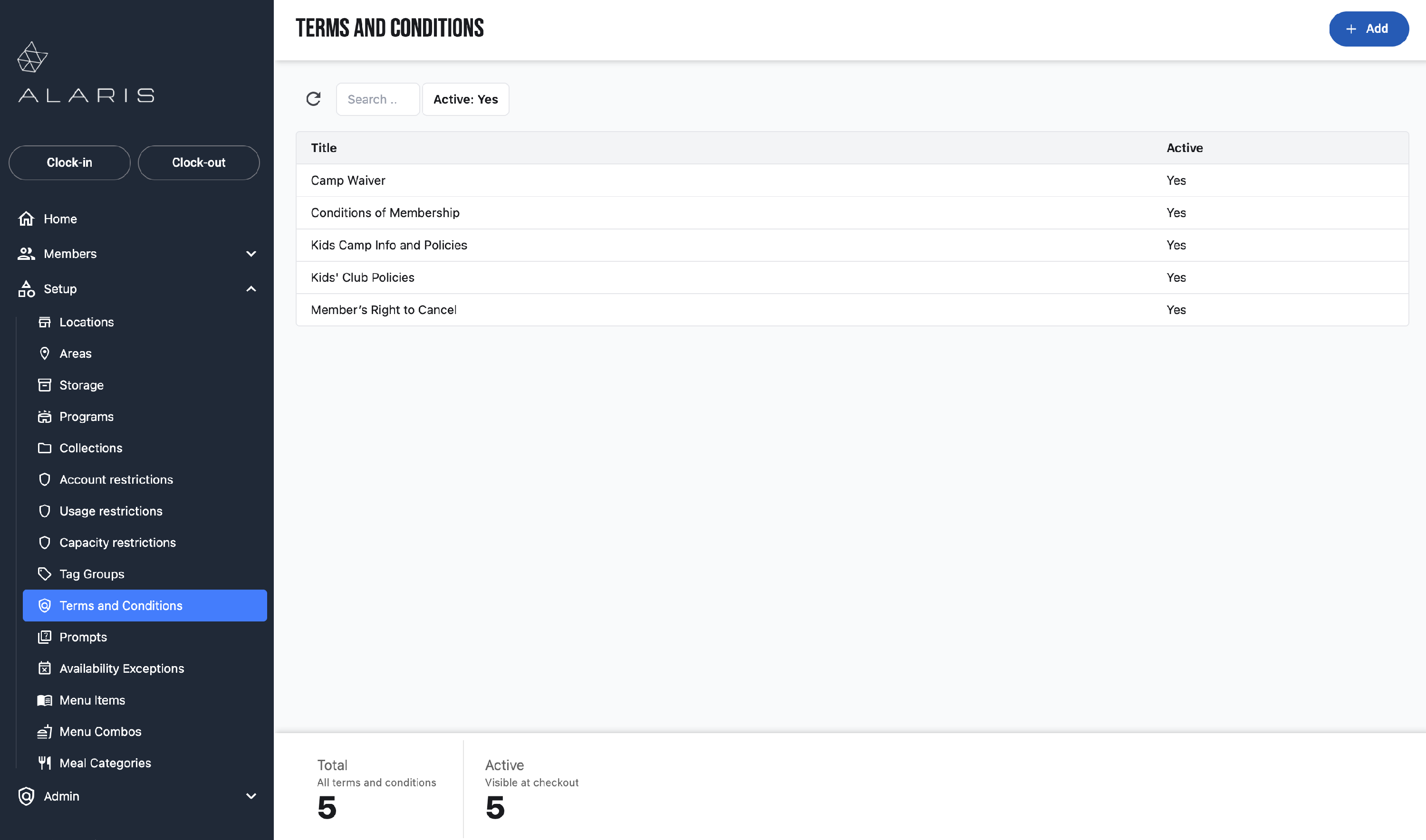 In the Admin App, you can add Terms & Conditions to your programs to require your members to agree to your terms prior to booking programs.