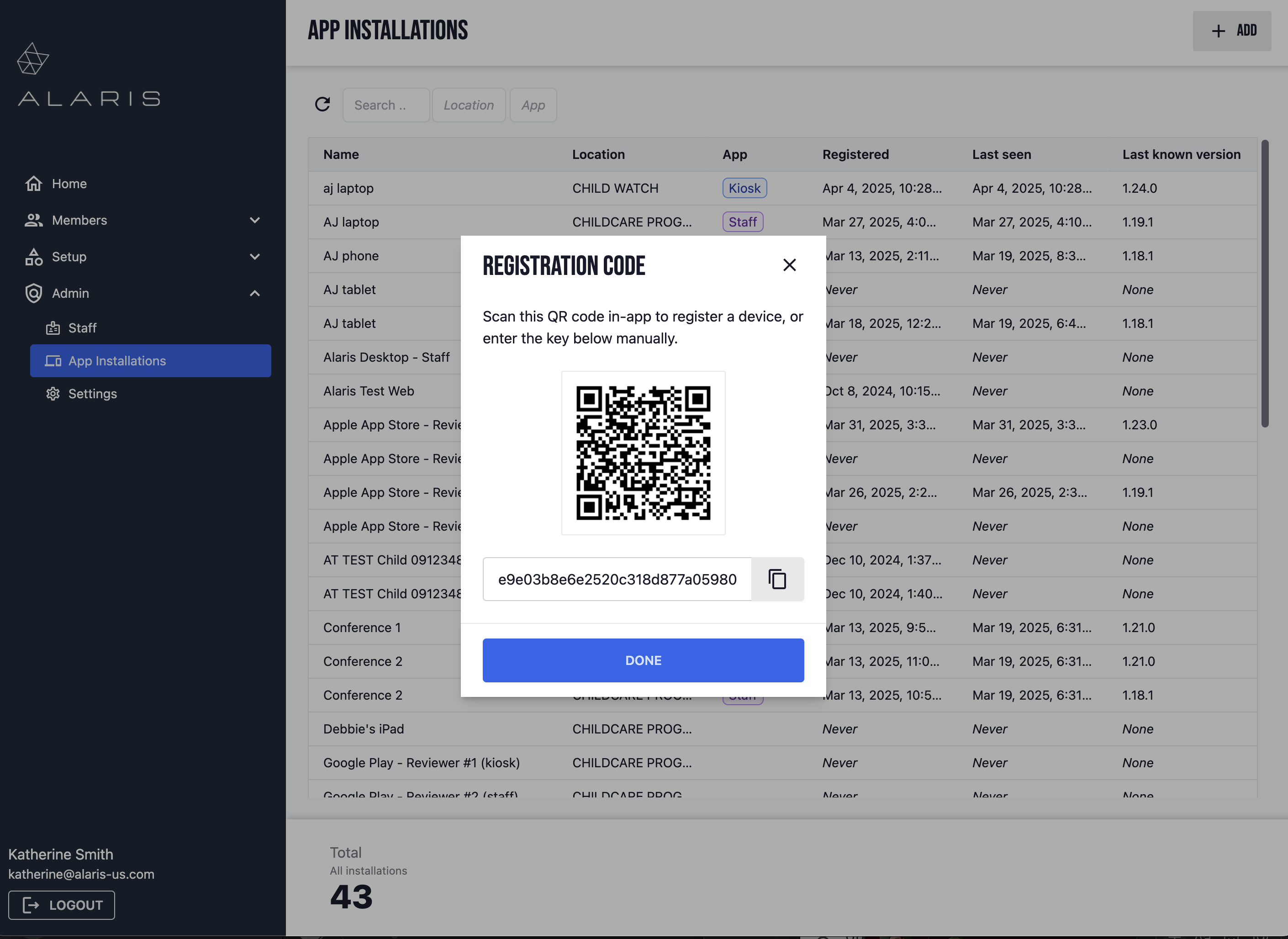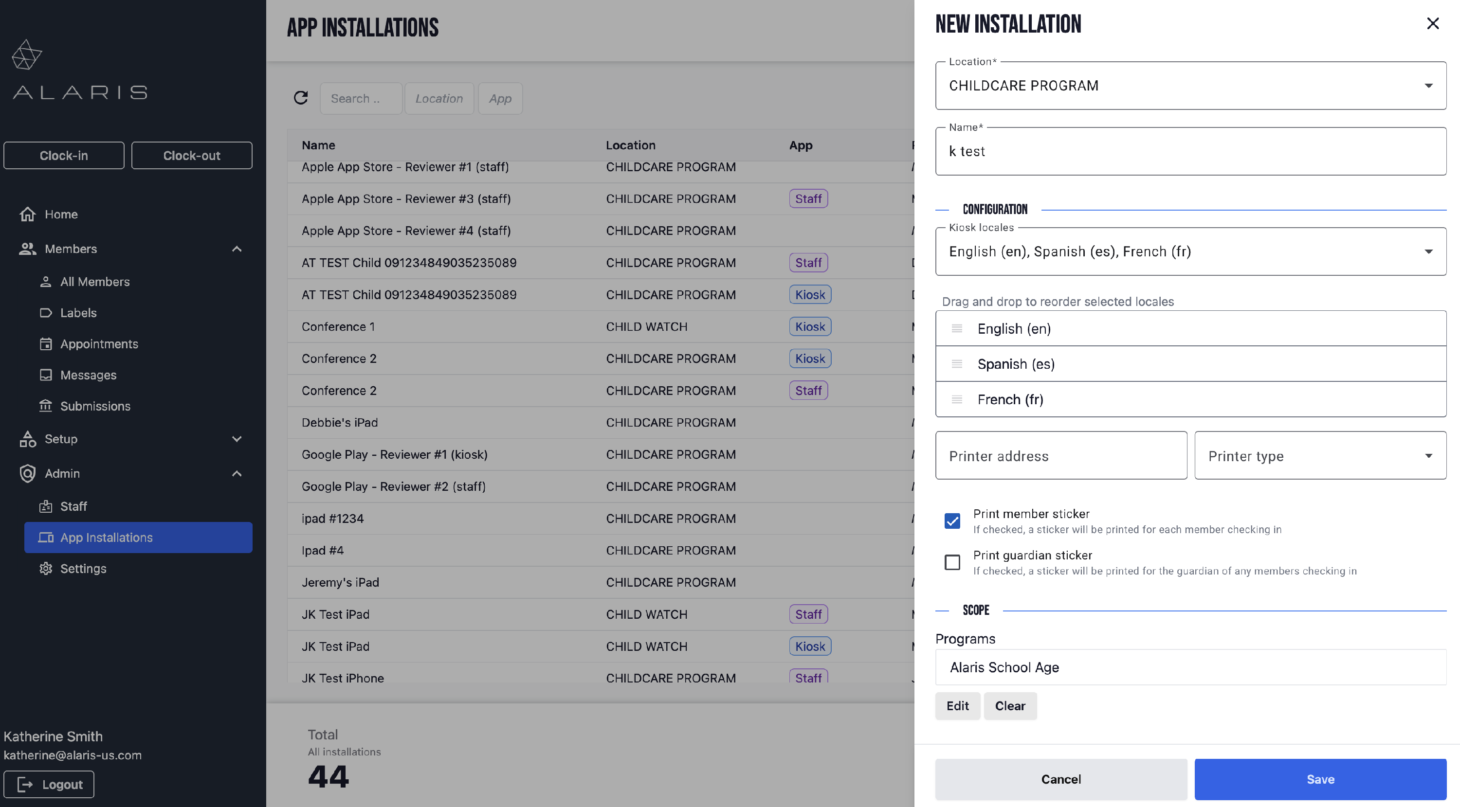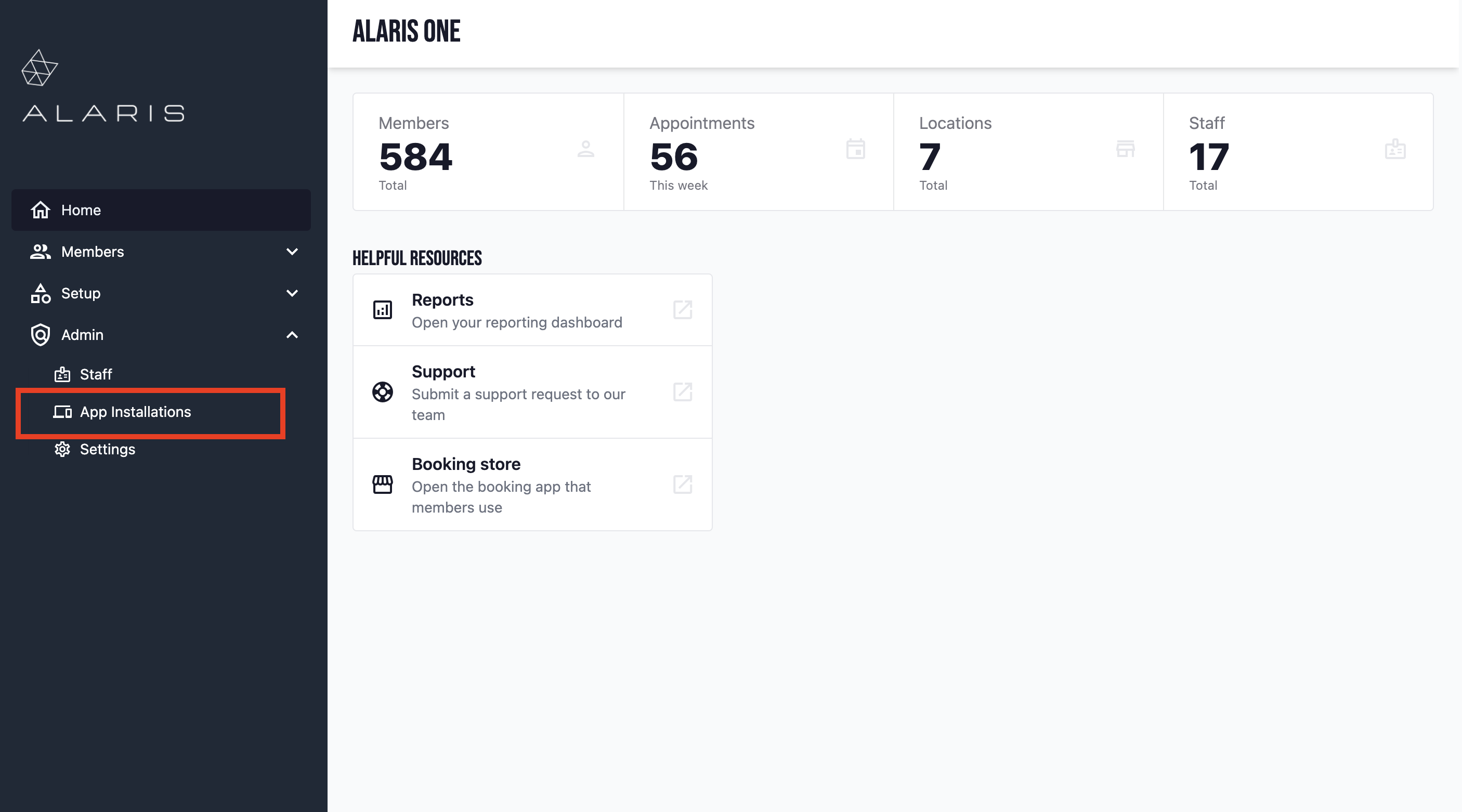 - Next, you will open the Alaris Staff Web App and login. Then, under Admin, select App Installations.