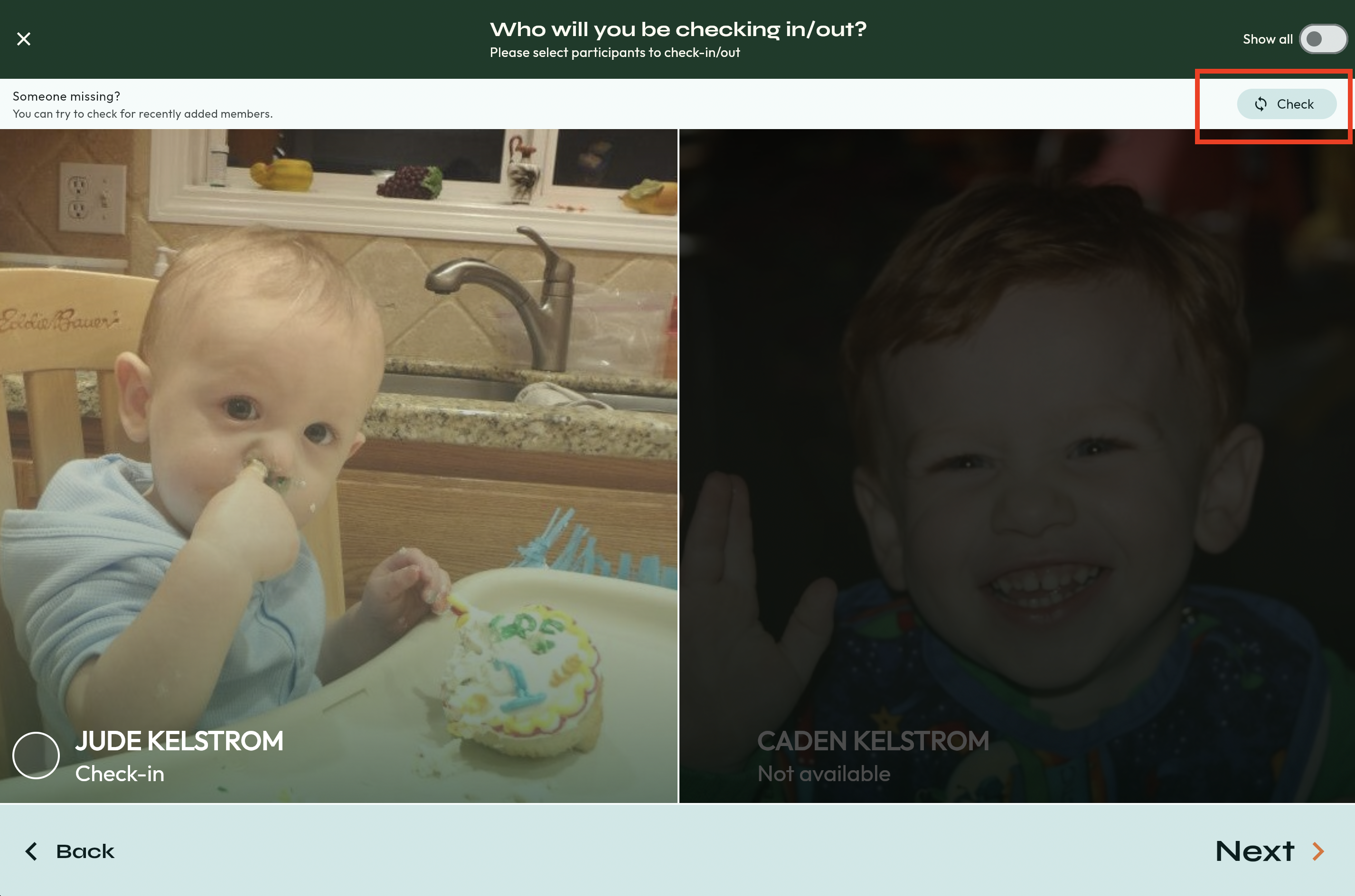 - During check in, if you are missing a member for check in, select the "Someone Missing?" check button to sync the family.