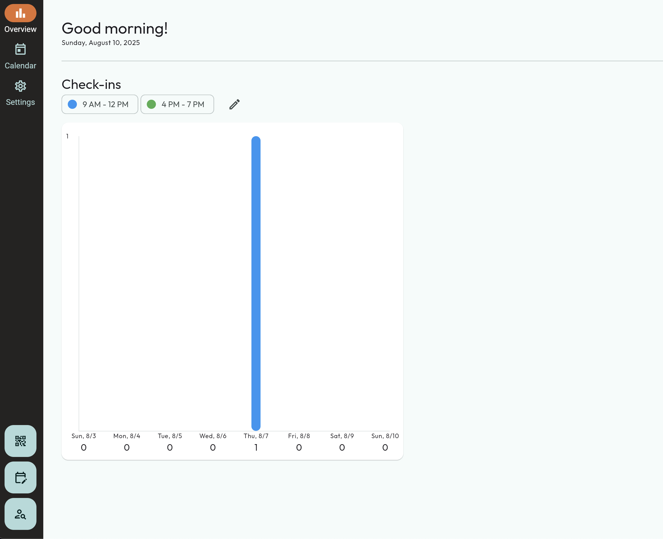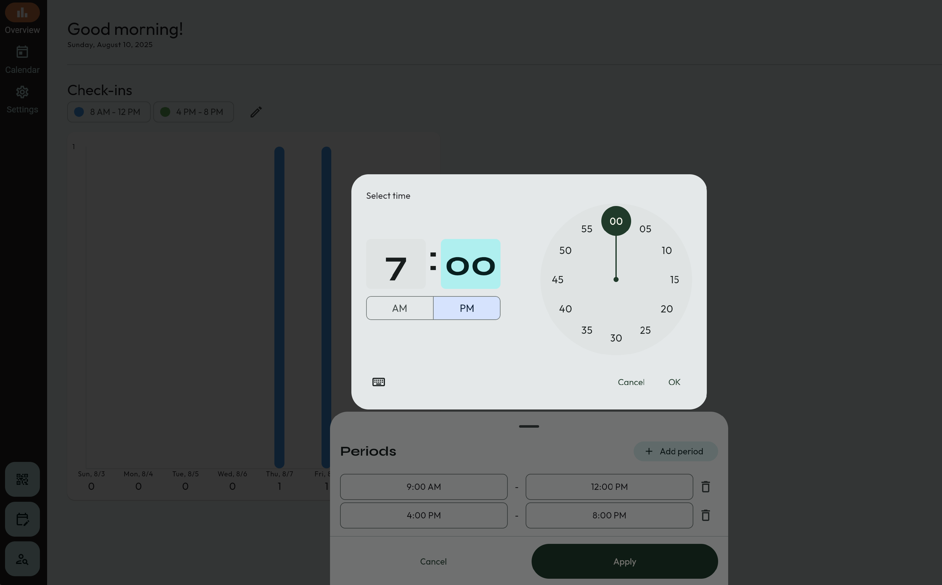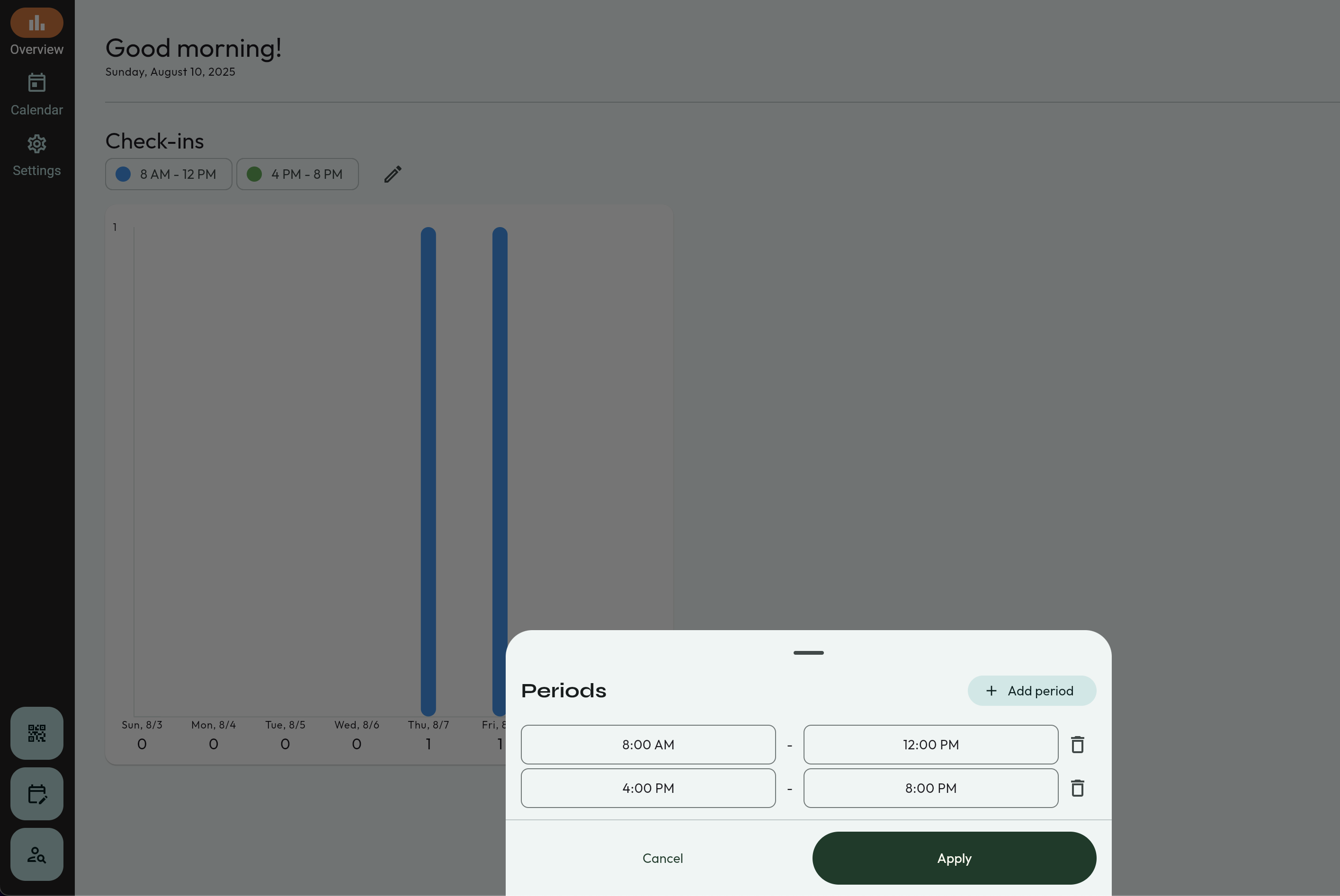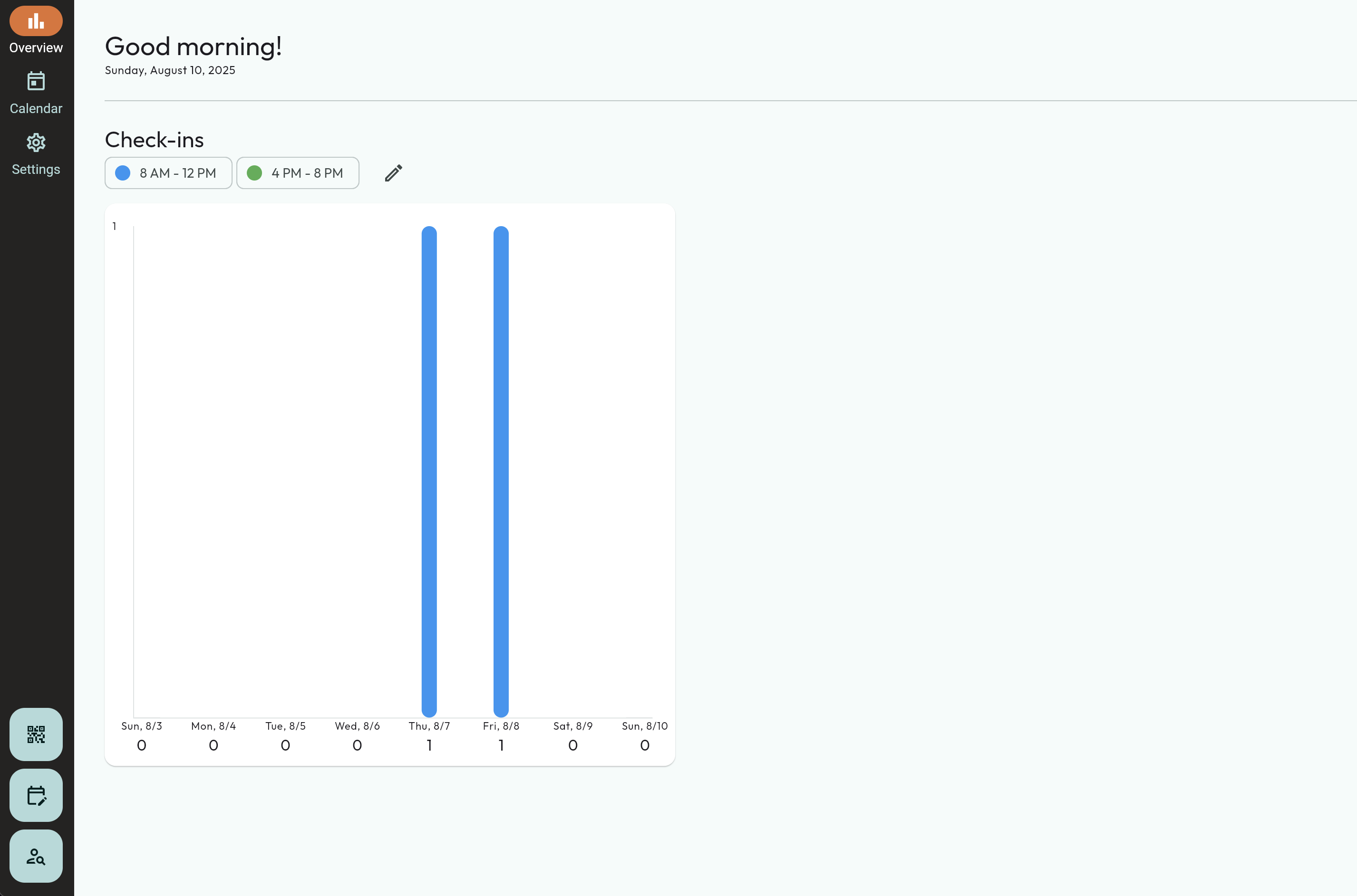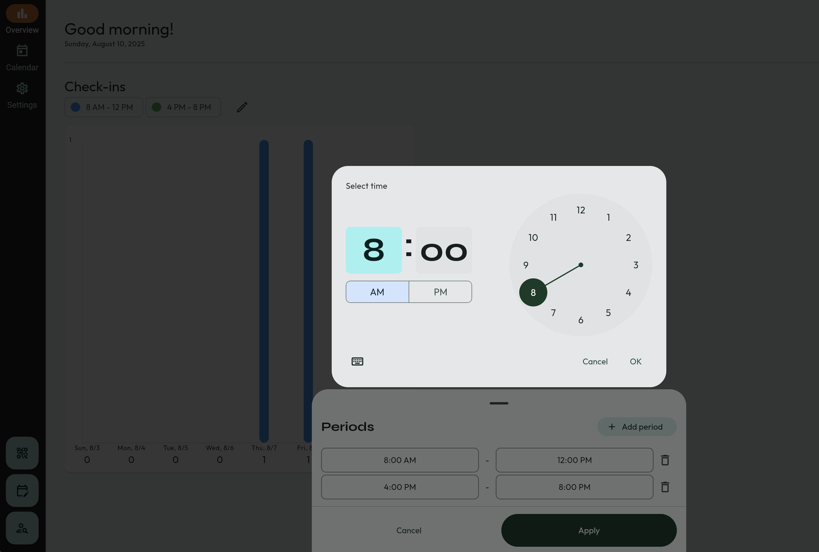 - The bar graph will be on this page. The default times for this graph are 8:00am - 12:00pm, and 4:00pm to 8:00pm. This can be adjusted.