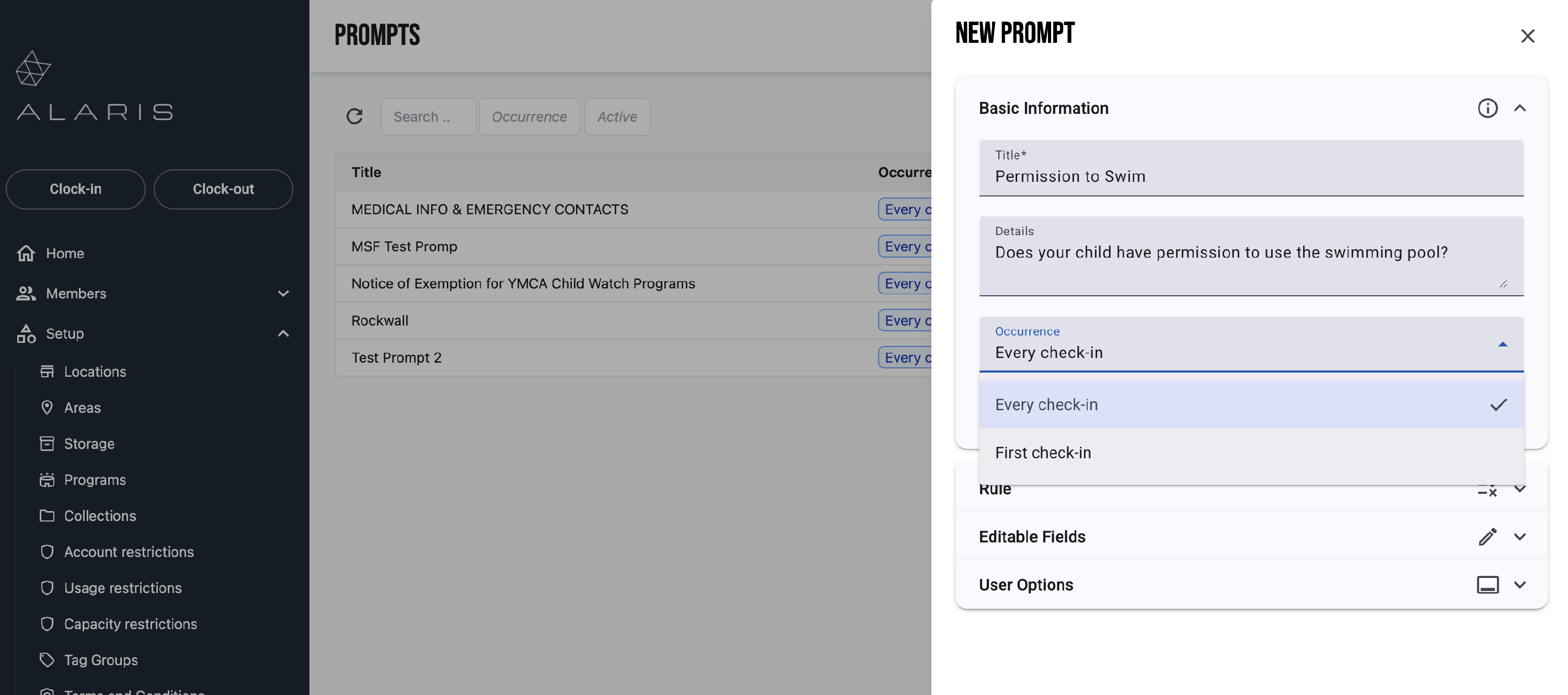 - Next, you will set the Occurrence. This means how often the prompt will be presented during check in.