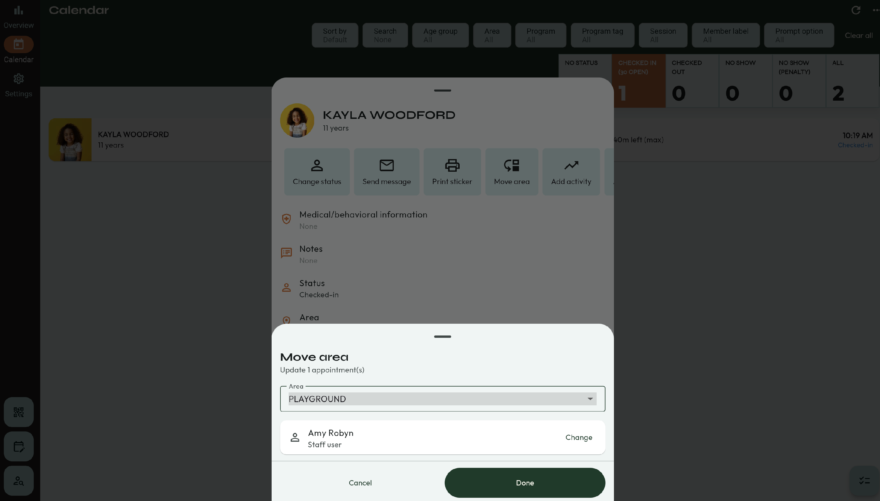 - A new window will appear. Here, you will be able to select the Area you are moving them to, and the staff member who is making this change.