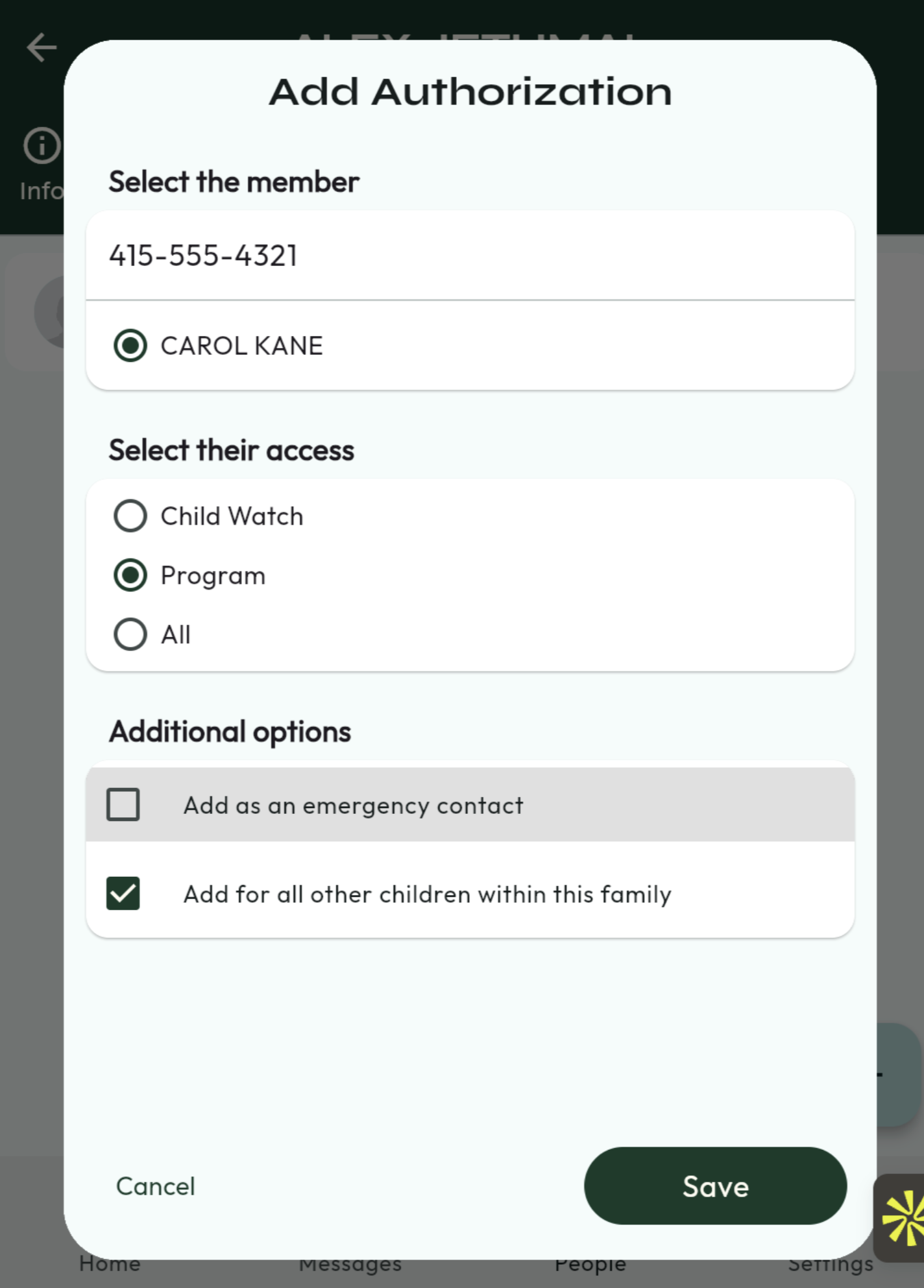 - Here, you can select whether or not this user will be Authorized for All Children on the account as well.