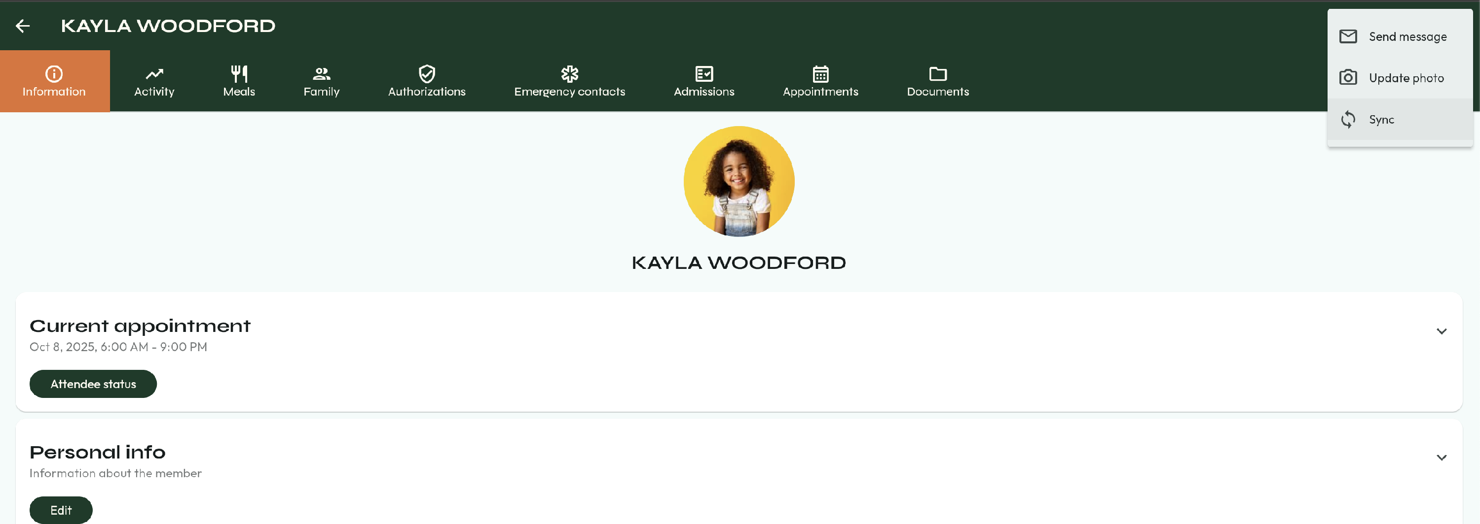 You can sync accounts of any member in the family screen of the Alaris Staff app, as shown below (example).