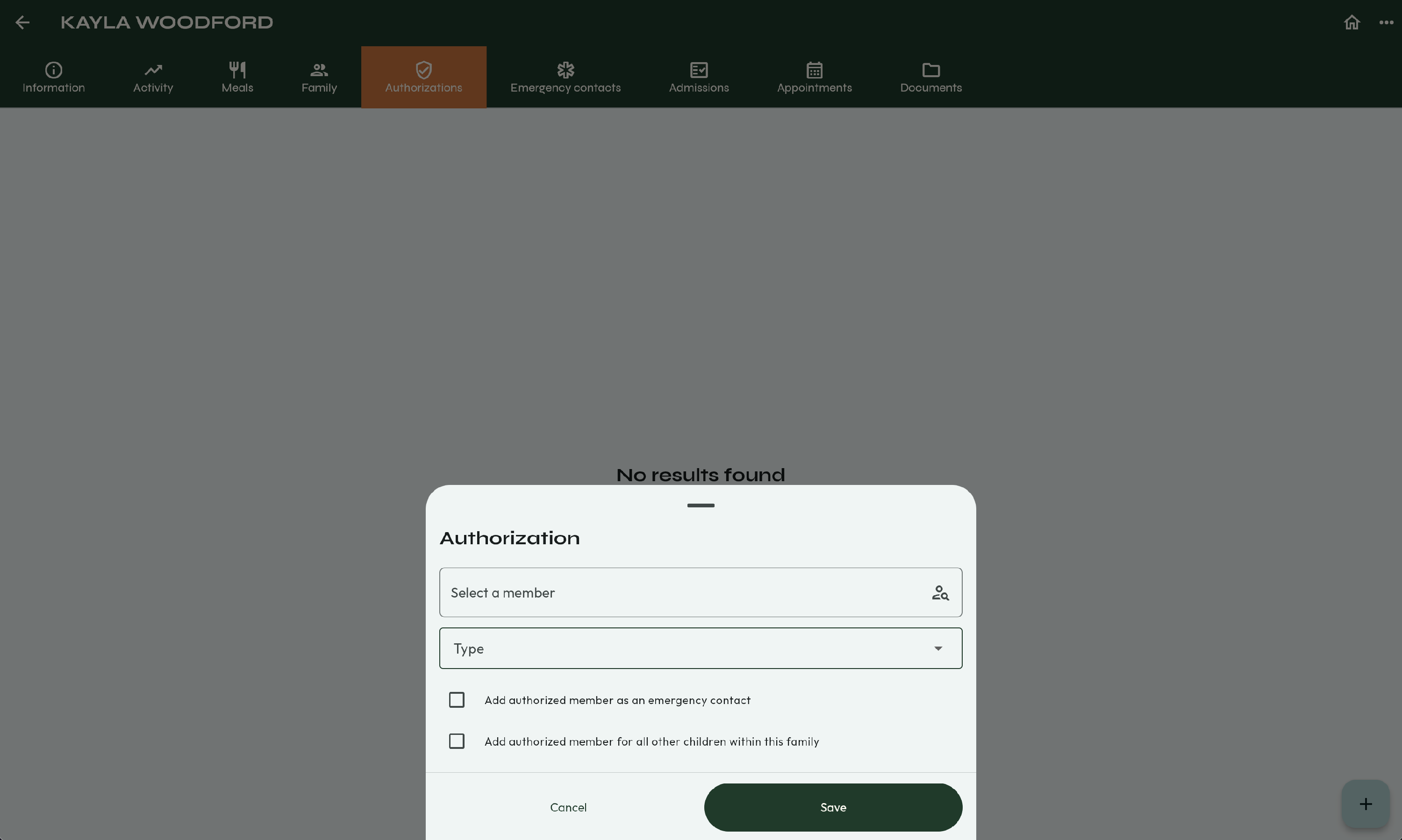 - You will then select the Type (Program or Child Watch), whether this user will be an emergency contact, and if they should be added as an authorized user for all children on the family.