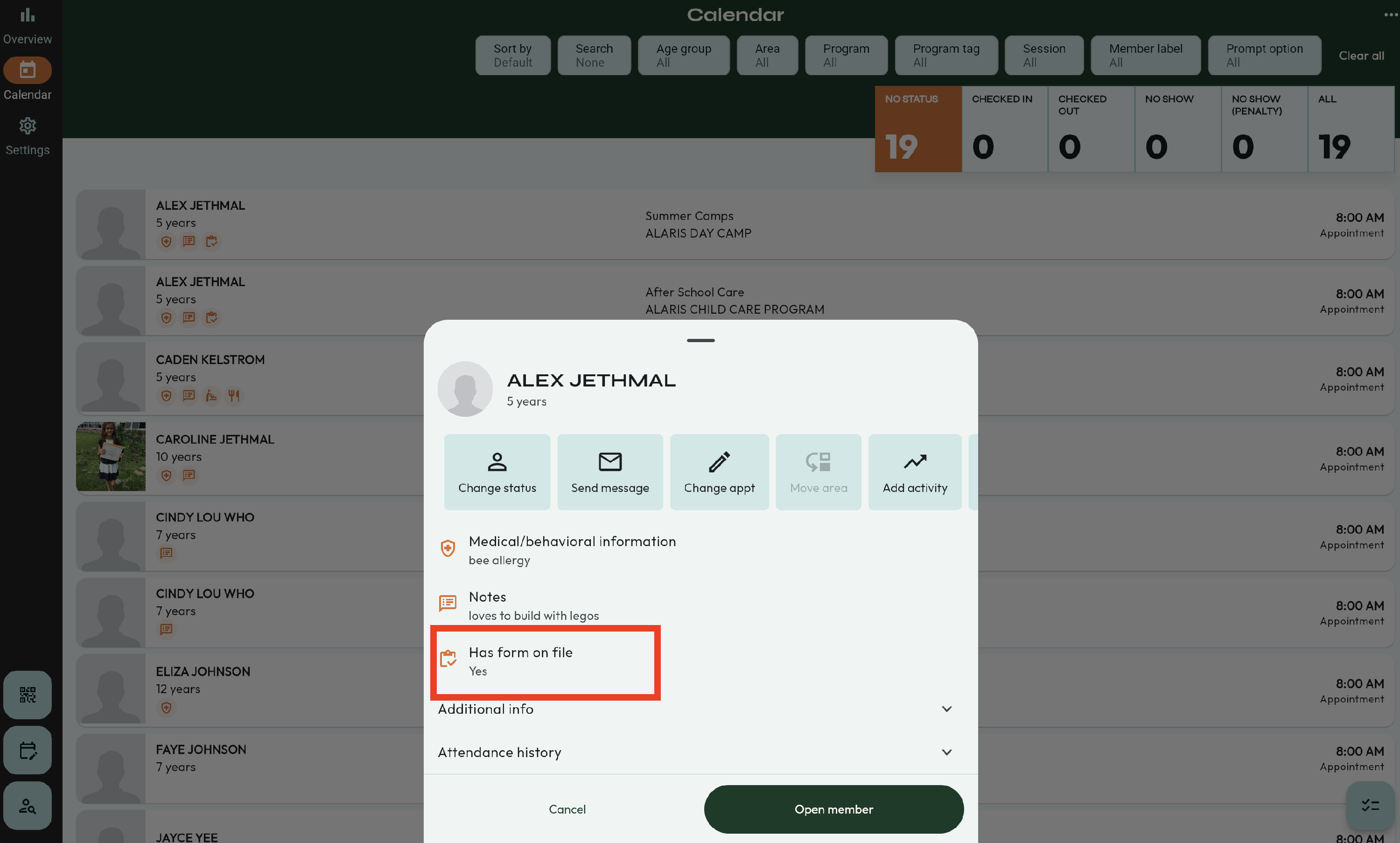- On the main screen, the children on your roster will appear. A Form icon will appear next to their name if they have a form on file: