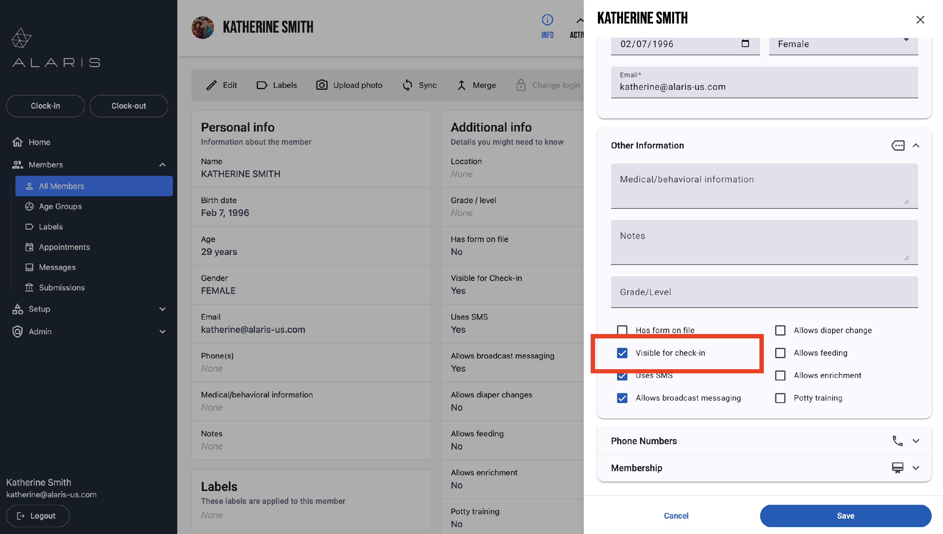 - If you would like to hide the user, un-check the box. Then the user will not be visible for check-in.