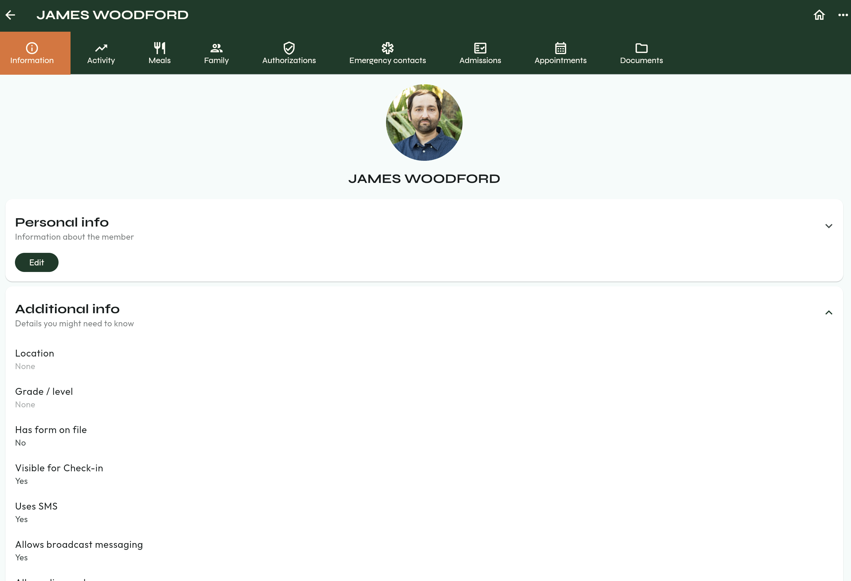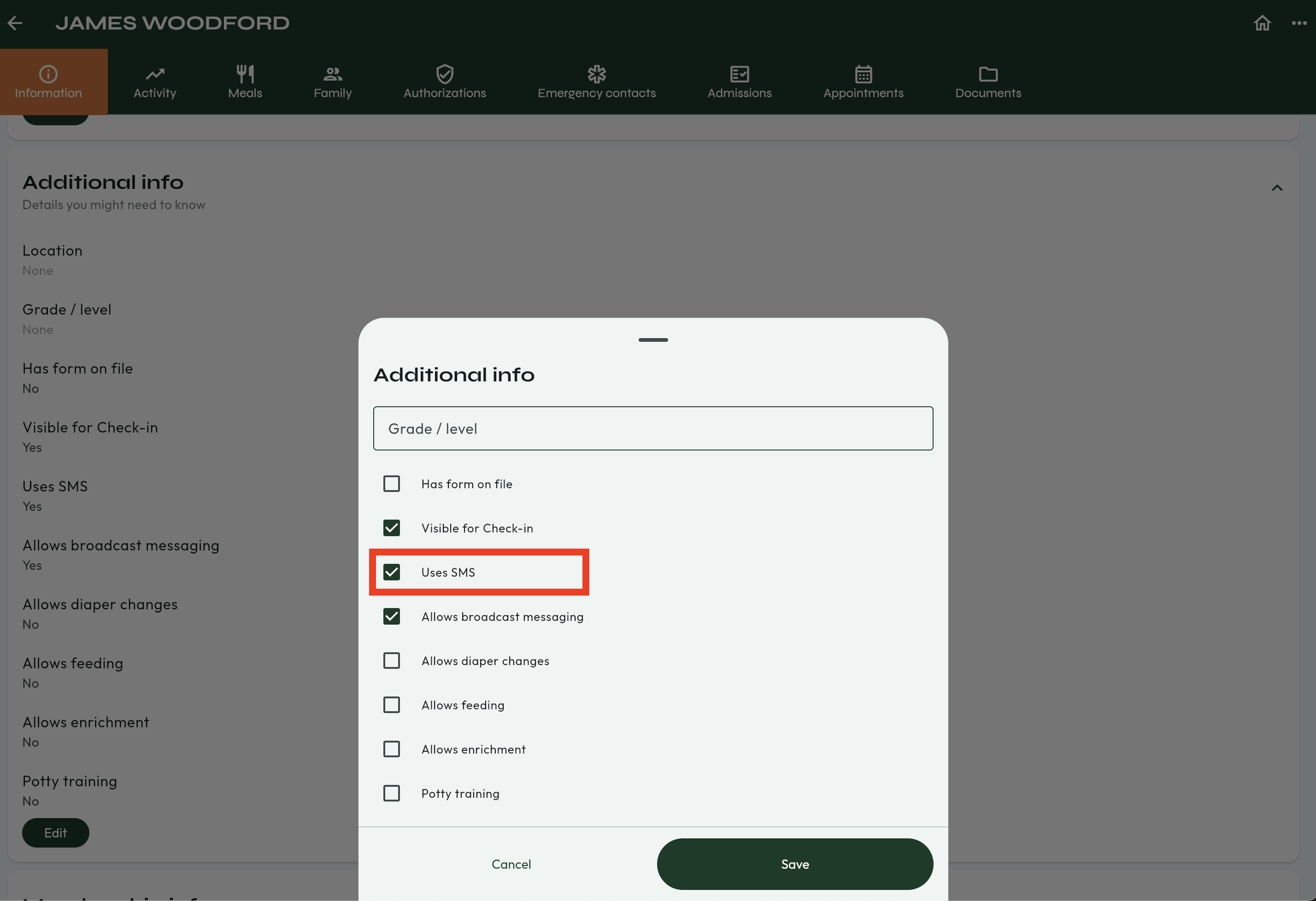 To send text messages using the Alaris Child Watch Staff app, you first need to make sure the adult you are text messaging has either a Cell or SMS phone number on file and has Texting Enabled set to Yes, as shown below.